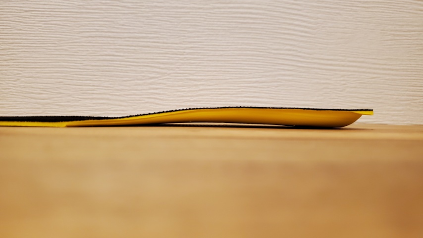ここに加えて、前述の通り内側縦アーチ、横アーチに対する支持は全くない設計、かかとも浅くできており、かかとの外反、足部の回内、扁平足傾向の足に関しては全くといっていいほど対応できない、悪化させる場合もある特殊なインソールです。