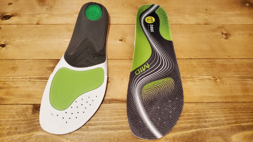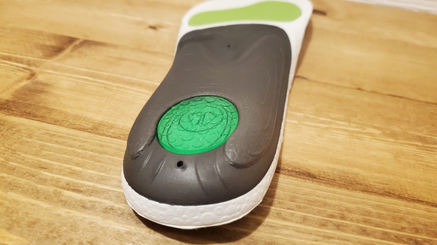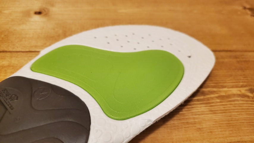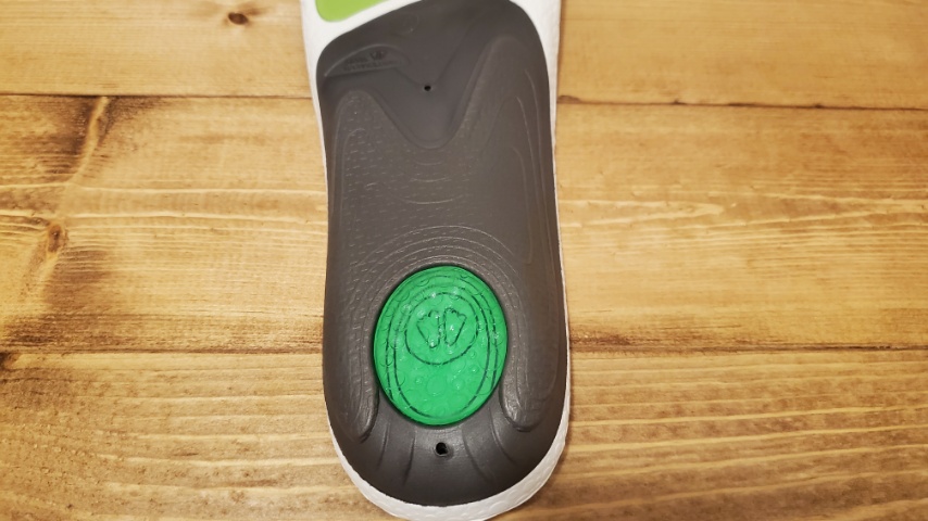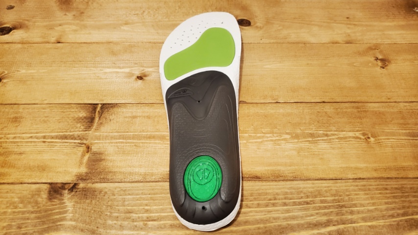スニーカーやランニングシューズでは、あまりに靴側にクッションがありすぎると過剰になることがあり得ますが、インソールとしてはかかと直下へのダメージを直接緩和する、衝撃緩衝機能となっています。