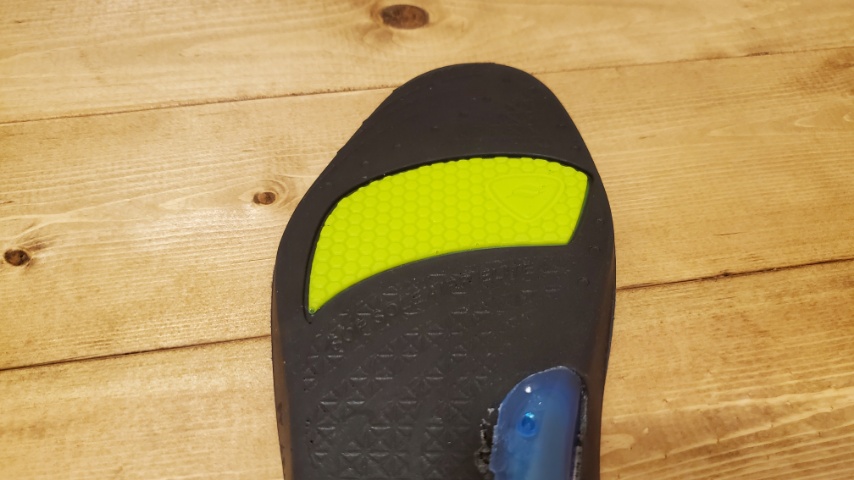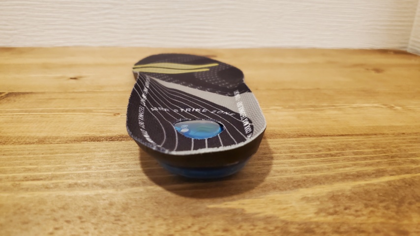 このジェル状のパッドに粘着性があるため、シューズ内部でインソールが遊ぶ事を防ぐ役割と、衝撃吸収と高反発性を引き出す設計となっています。