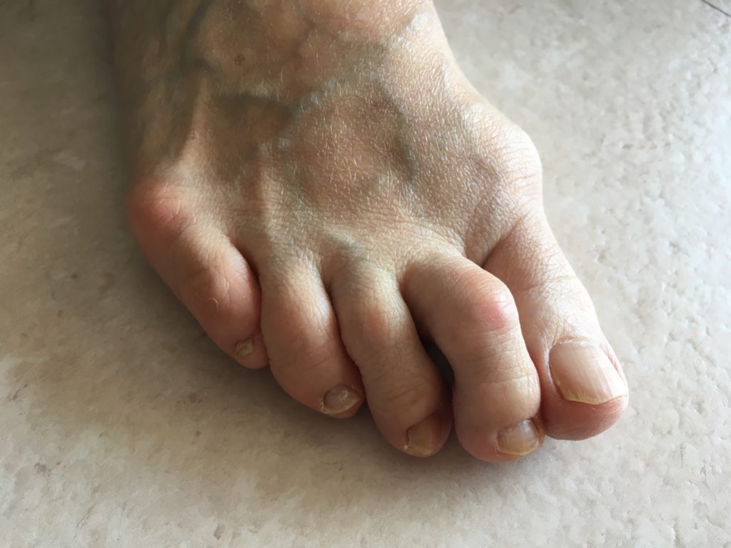 特に外側縦アーチ、横アーチが機能していない場合も多く、小指が内巻きで使いづらくなってしまうため、ふらつきやすく転倒しやすくなりがちな症例です。