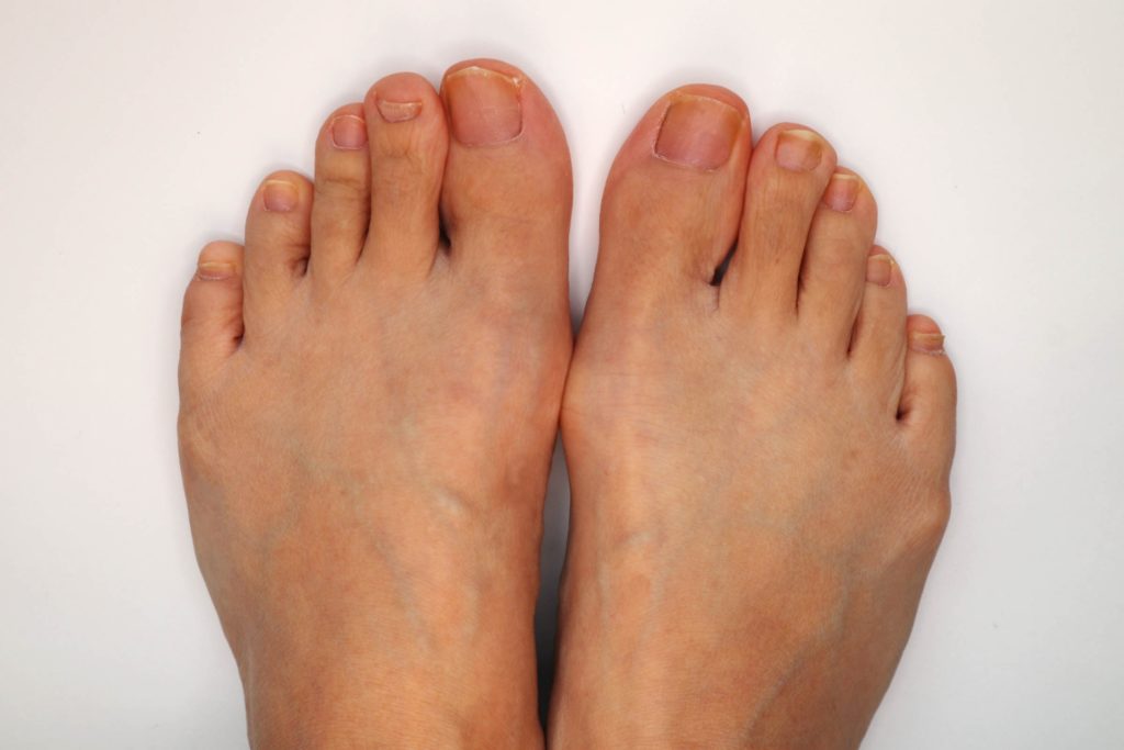 外反母趾は足の裏を支える土踏まずが低下することで発生するケースが多く、他にも靴の影響や遺伝によって引き起こされやすい症状です。